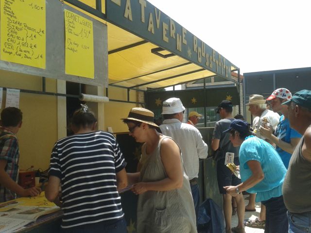 How do you do that? Why, by watching Le Tour on television, of course! Jean-Michel and I watched the opening hour or so on the television before I followed Patricia into the town center to see what was happening. The normally dead quiet streets of the village were now active. They weren’t spilling over with excitement, but there was a feeling in the air. The hot summers day had allowed the town to set up a festive atmosphere in the central square where some wine tastings and a barbecue was happening.